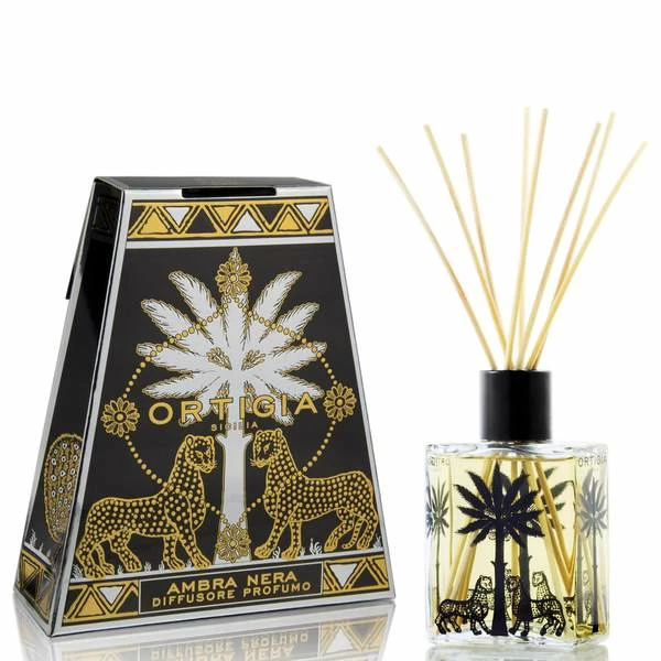 Create a luxurious ambience with the Ortigia Ambra Nera Palma Diffuser. Inspired by warm summer nights on the Island of Sicily, the scent features notes of Resin and Spice Wood, an amber base of Labdanum, Oak Musk, Galbanum and Amber Resin. The elegant diffuser is housed in a beautifully illustrated diffuser with a palm tree and leopard design. The perfumed liquid travels through the sticks, gradually filling your abode with the opulent scent of musky amber and spice. Packaged in a decorative box that’s perfect for gifting.