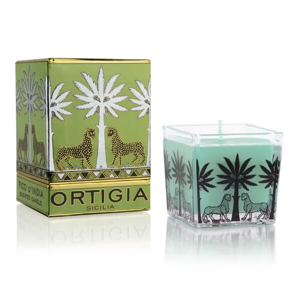 A signature palm and gattopardo-printed jar of pale green wax, scented with Cactus Flower, Fig and Cedar. The glass ridges create a stunning effect as the candle burns. 110g 6.5 x 6.5 cm Candle burns 20-25 hours To see our full collection of Ortigia products, click here Ortigia is a small Italian soap and scent company founded in Sicily in 2006 by Sue Townsend. The luxurious ranges of soaps, scents, creams, candles and lotions are formulated using natural products indigenous to Sicily and inspired by the aesthetics, colours and scents of Italy’s most historic and tropical region.