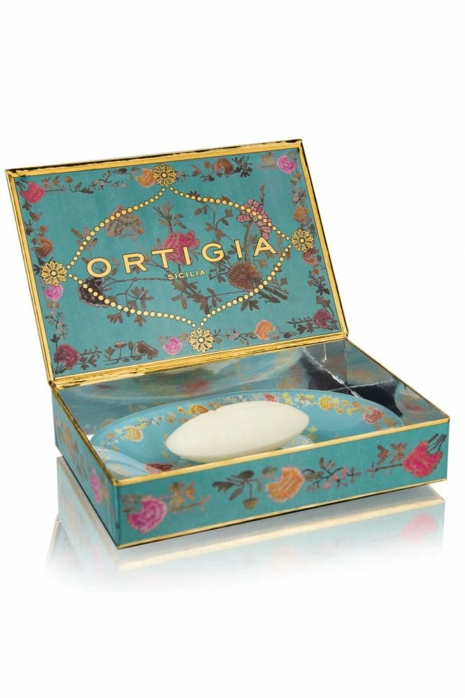 Ortigia Florio Glass Plate Single Soap Exotic, floral scent Sicilian spring flowers Sophisticated scent Natural ingredients Classic and luxurious Nourishes the skin Straight from the Mediterranean Beautiful illustrated packaging 40g