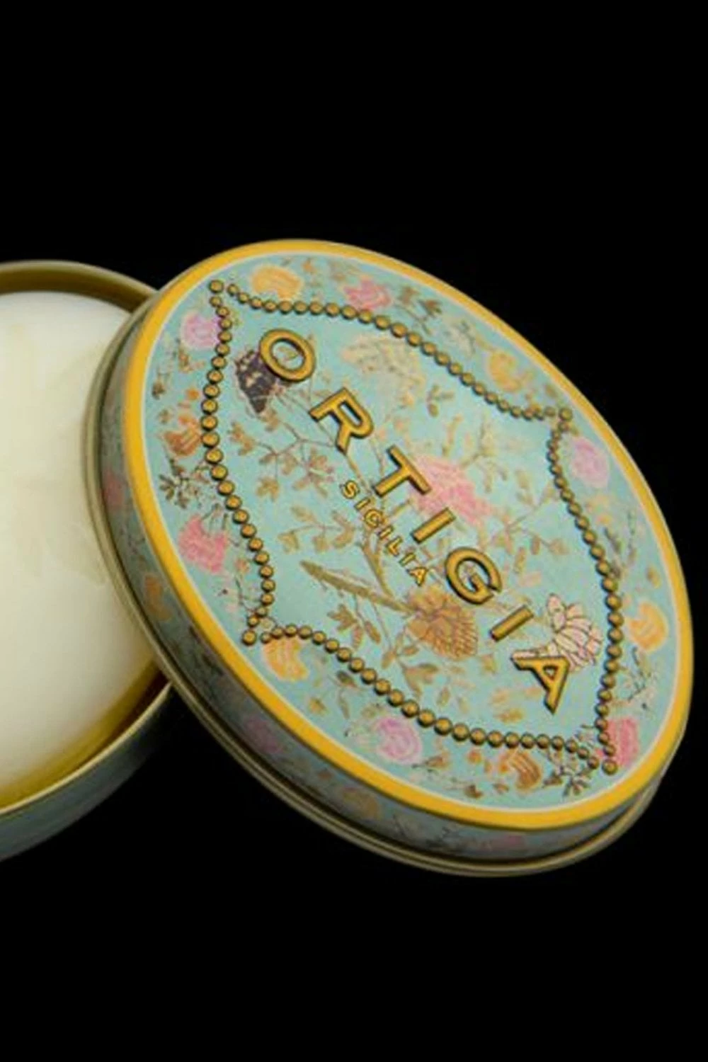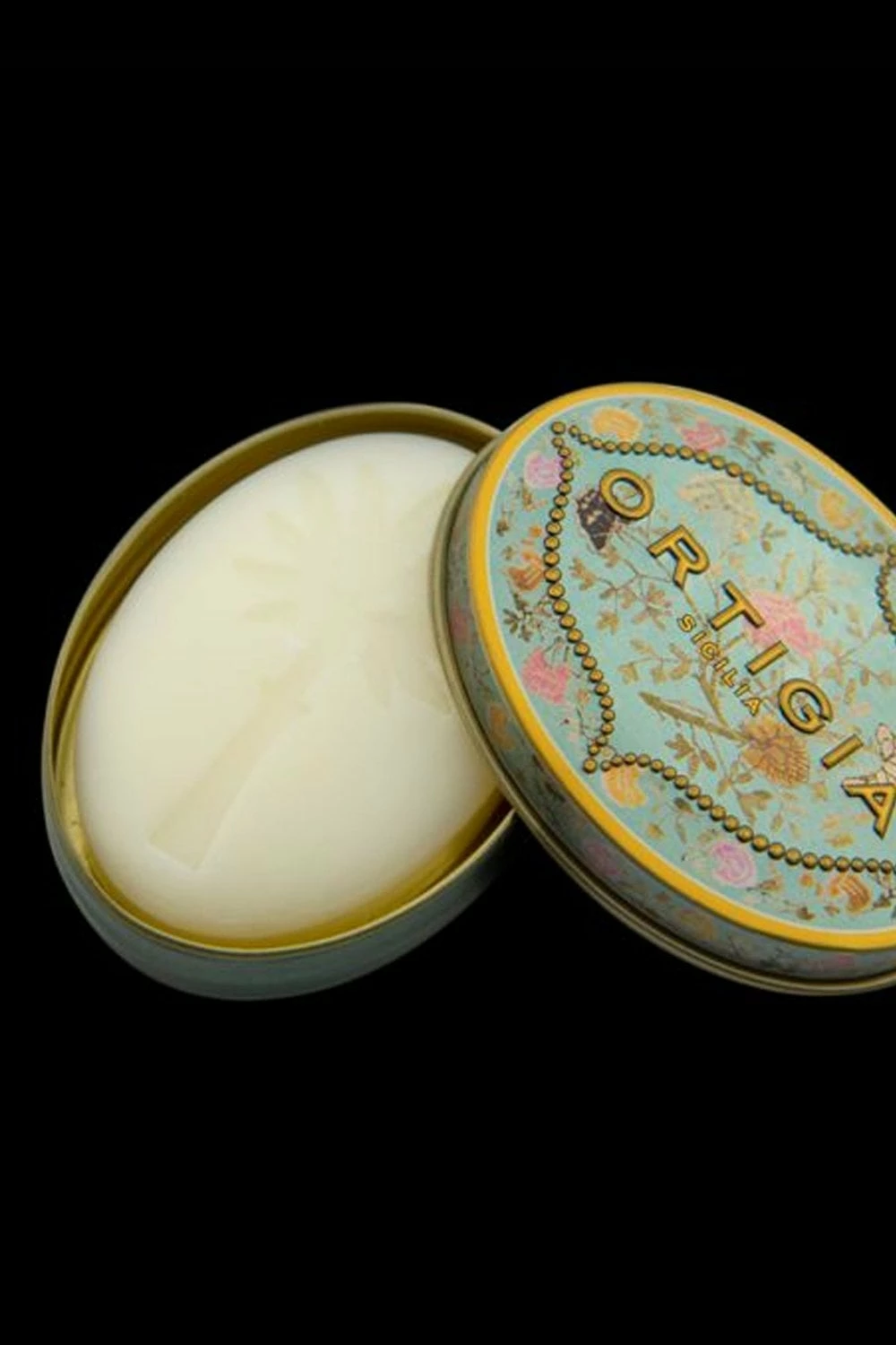 Ortigia Florio Olive Oil Single Soap Tin Classic and luxurious Nourishes the skin Olive oil and milk protein Naturally coloured Triple milled for smooth luxurious feel Breezy Scent of spring flowers Clean and Delicate Straight from the Mediterranean Beautiful illustrated packaging 6 cm x 5 cm x h. 1.5 cm 25g 43972