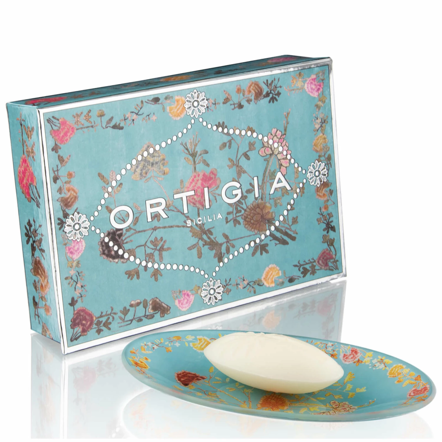 Treat yourself or a loved one to the beautiful Ortigia Florio Glass Plate & Soap Set for a luxurious bathing experience.