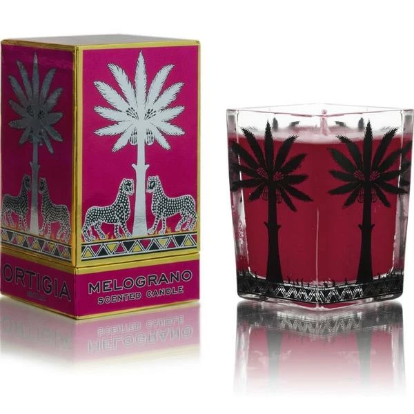 A large palm and leopard-printed jar of wax infused with the scent of crisp, dry pomegranate. The glass ridges create a stunning effect as the candle burns. Candle burns 40-45 hours 170g 9.5 x 7cm Ortigia is a small Italian soap and scent company founded in Sicily in 2006 by Sue Townsend. The luxurious ranges of soaps, scents, creams, candles and lotions are formulated using natural products indigenous to Sicily and inspired by the aesthetics, colours and scents of Italy’s most historic and tropical region.