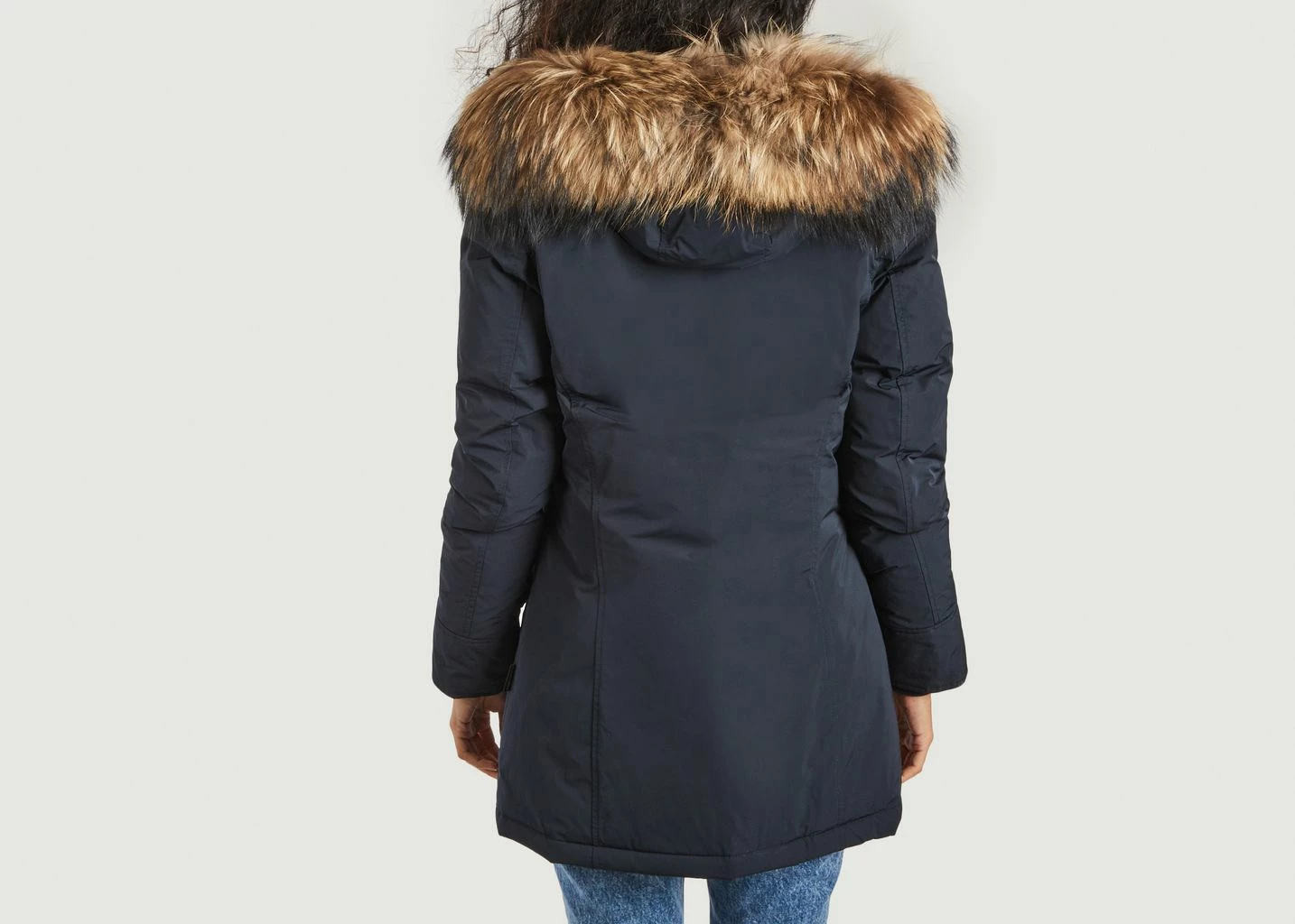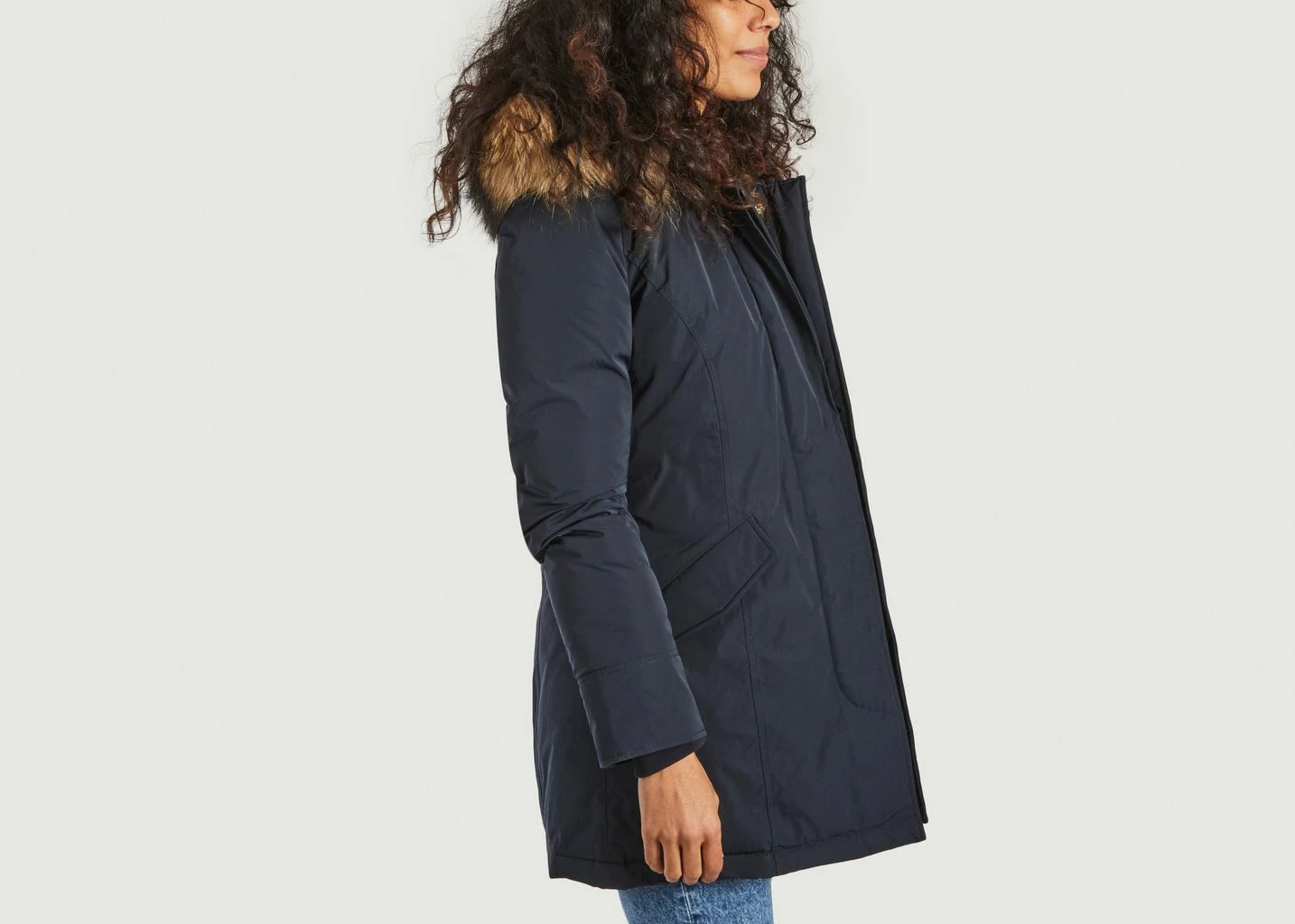 A long-sleeved polyester parka with a full hood, removable fur trim and numerous pockets, as well as a front zip and button closure. The windproof and waterproof outer layer is made from Woolrich’s signature cotton-nylon blend, then specially treated with Teflon for added protection. Designed to embrace a current, dynamic lifestyle, celebrating Woolrich’s DNA and heritage, this women’s Arctic parka is as feminine as it is versatile. It will keep you warm all winter long thanks to its thick duck down padding and handwarmer pockets.