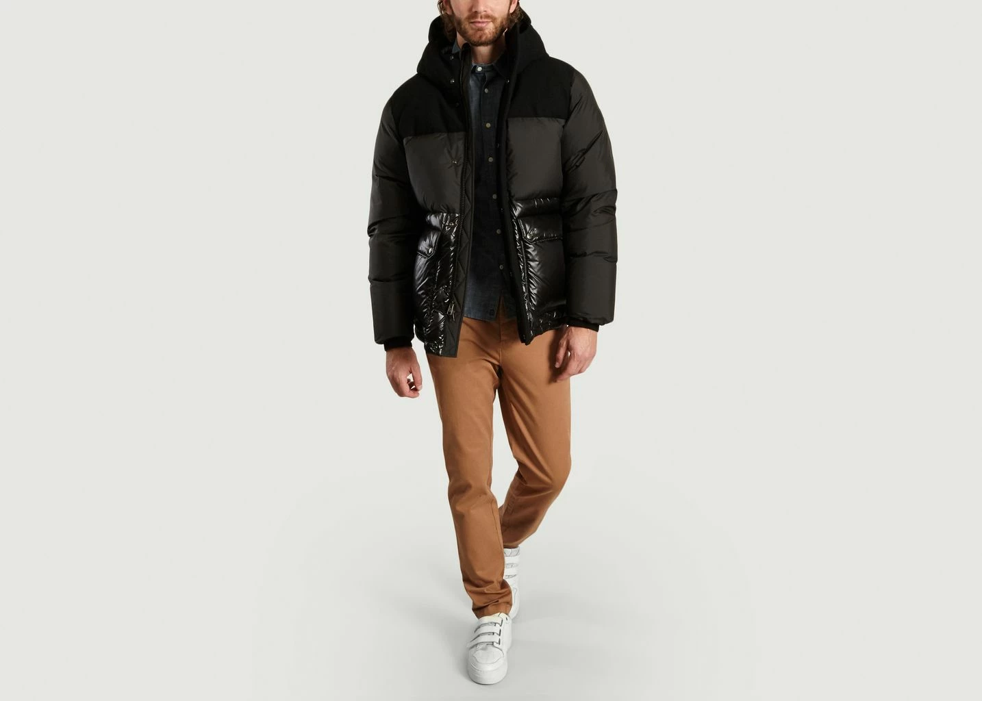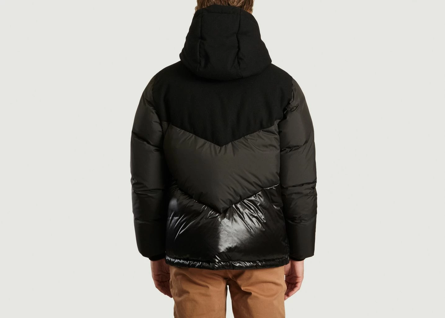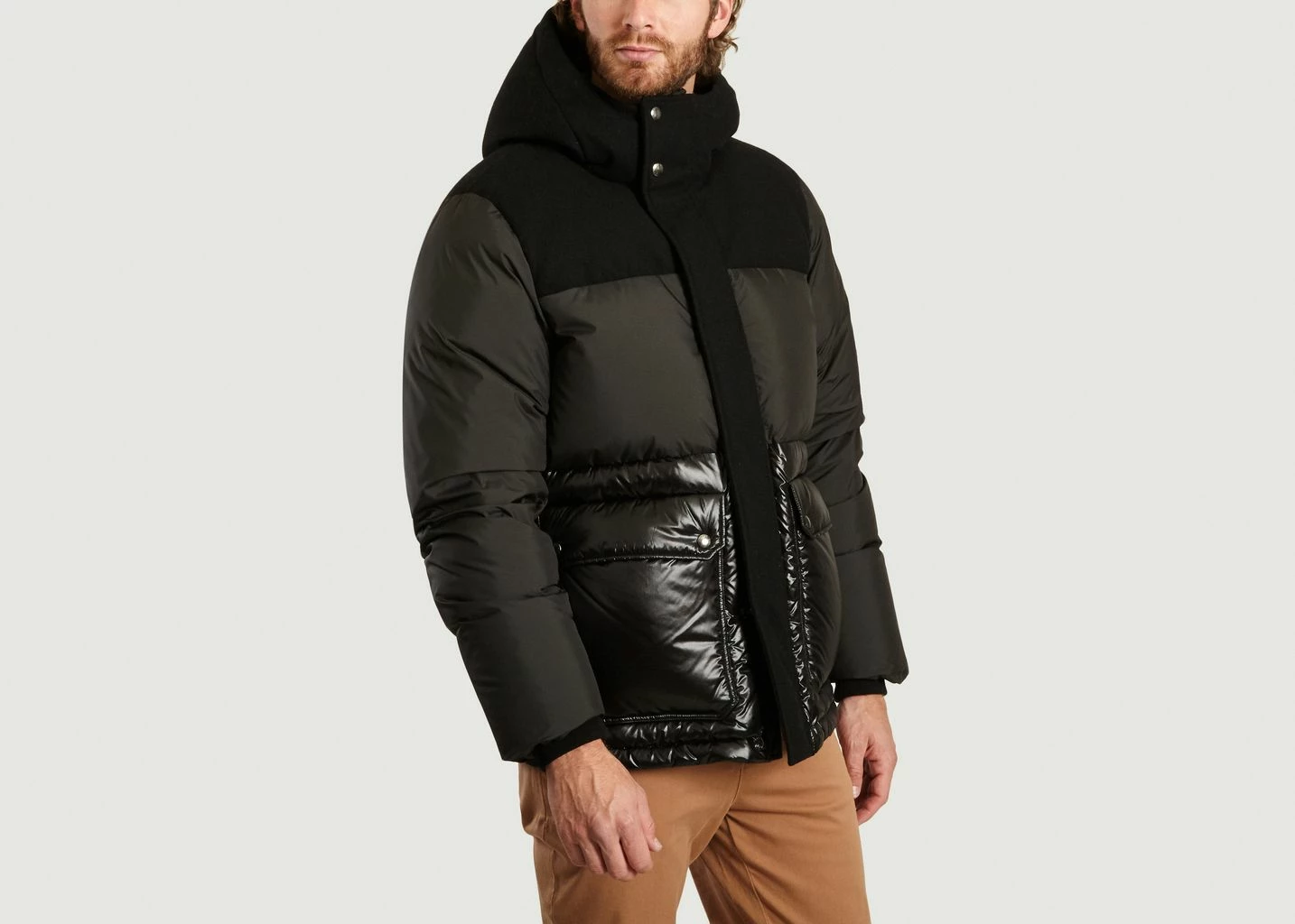 Black polyester and wool panelled jacket, high standing collar with integrated large hood, long sleeves, main zip and press stud fastening, large utility pockets, thick padding, straight fit. A core USA-based outfitter since 1830, Woolrich has been crafting stylish outerwear since the heyday of USA manufacturing. The oldest producer of outdoor wear in the United States, today the brand is known for its classic Arctic outerwear and urban-inspired silhouettes. Accentuating a 90s streetwear silhouette with contemporary detailing, this XXL puffer gets a sophisticated update with this ôlyester and wool panelled version from Woolrich.