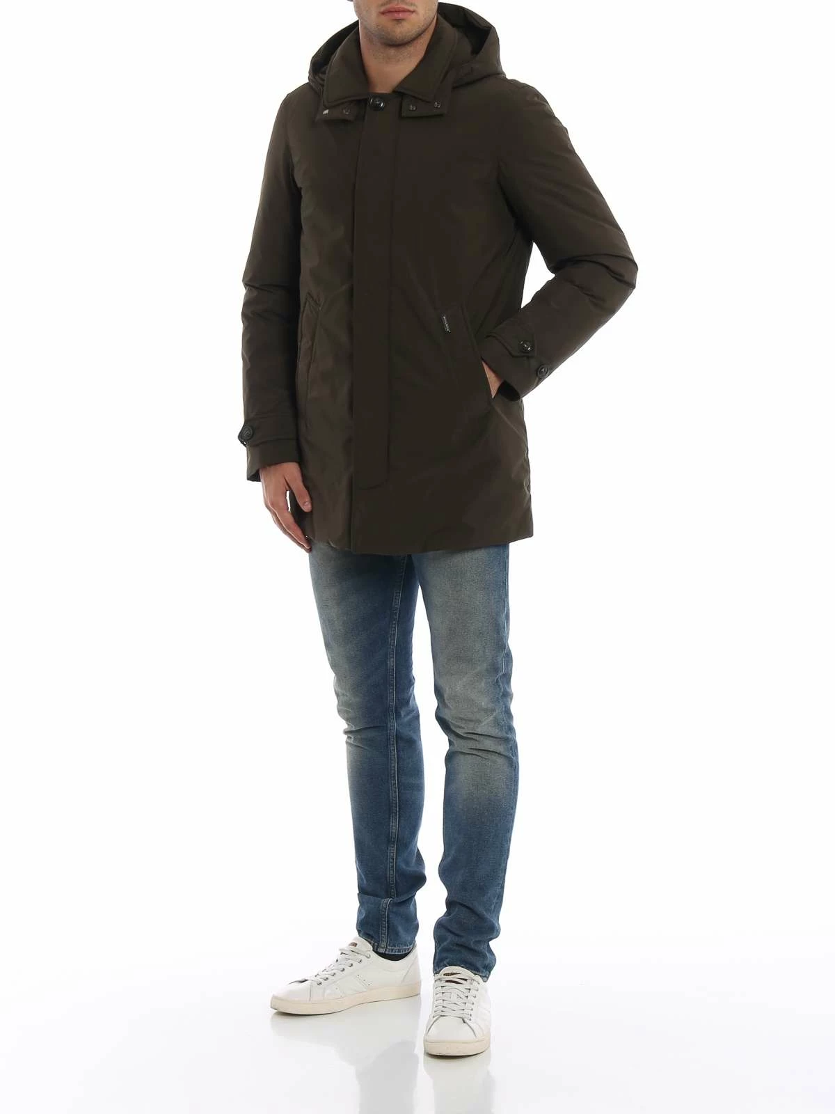 Abrigo de tejido técnico con práctica capucha desmontable y relleno de plumón 90/10.