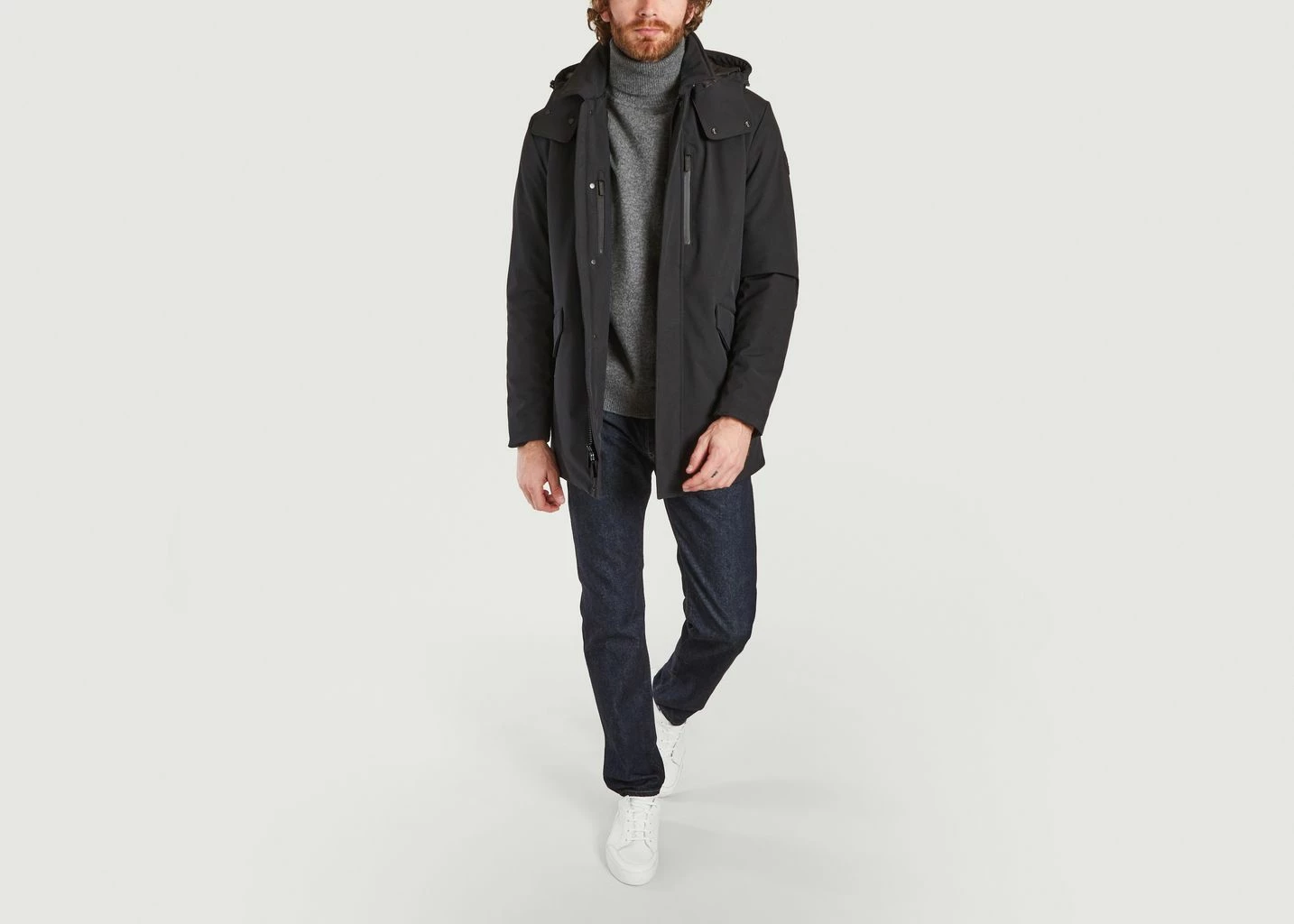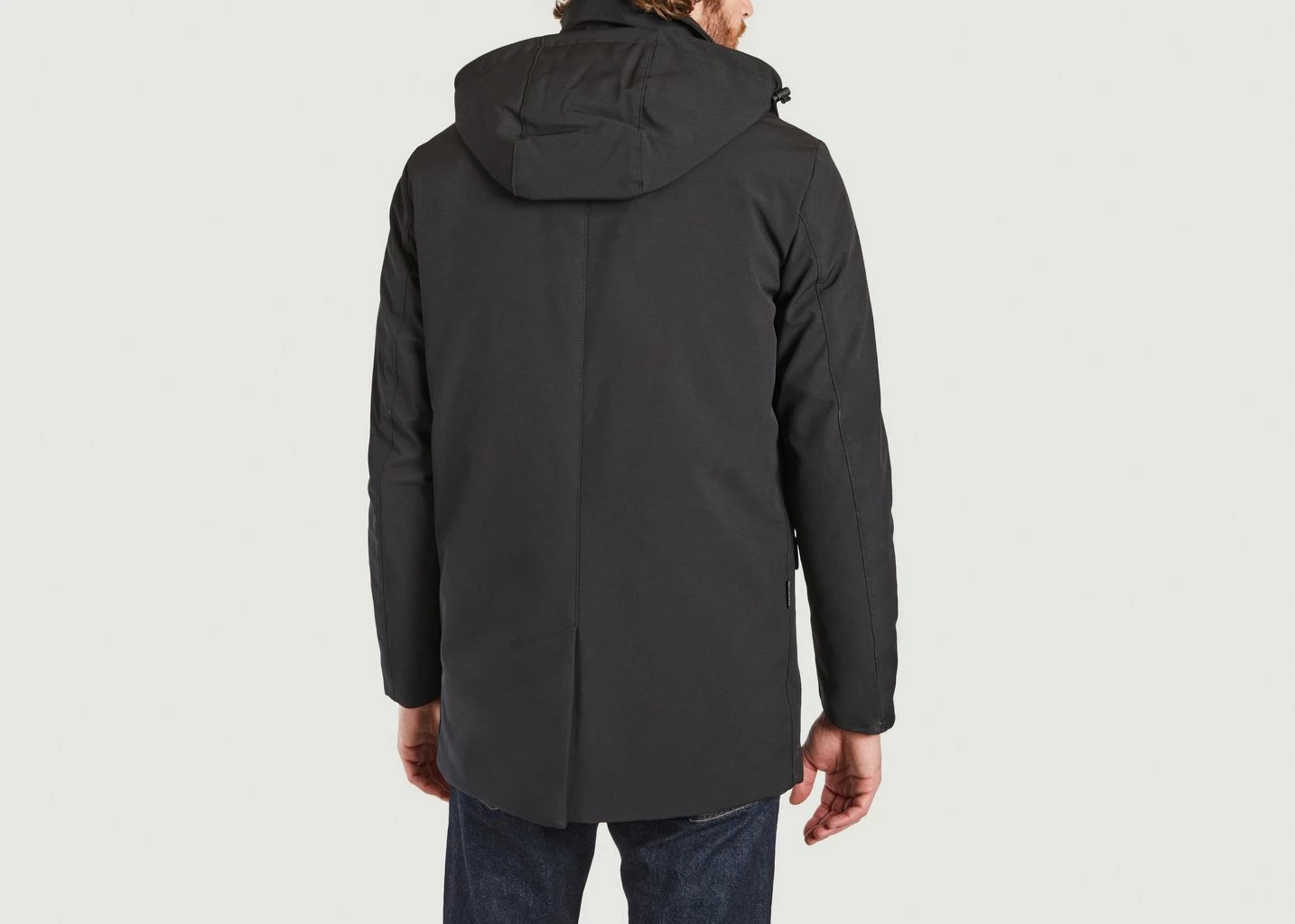 Black windbreaker jacket, made of polyester. Featuring a straight and wide cut, adjustable hood, shirt collar, long sleeves, concealed closure, flap and zip pockets, back slit, applied logo. Opt for this essential piece of the men’s wardrobe for autumn/winter. Perfect with its multiple technical pockets. Match it with light colored chino pants.