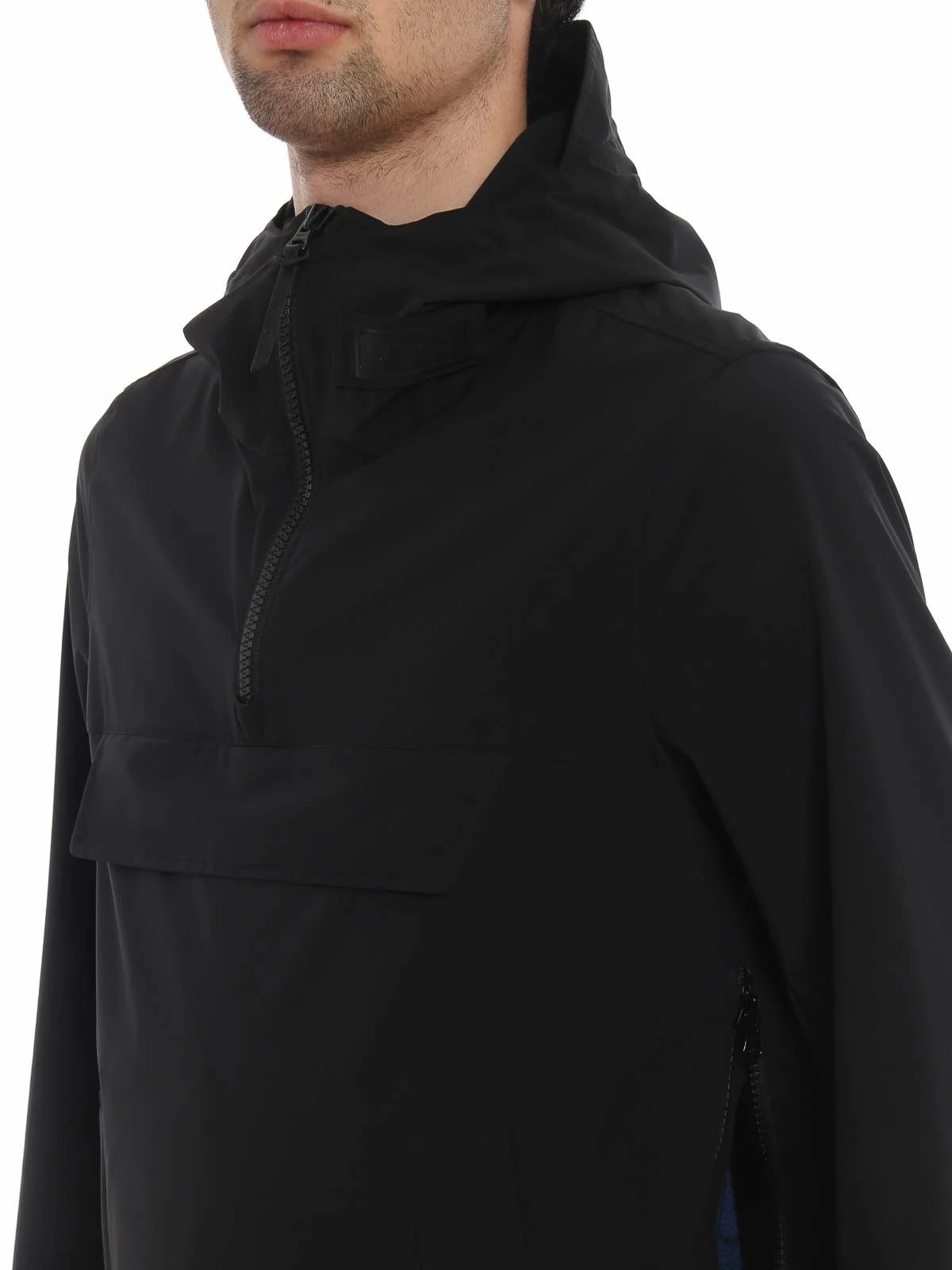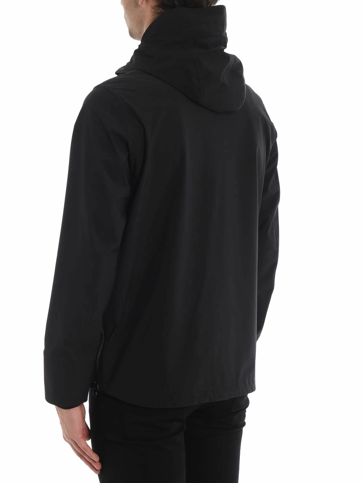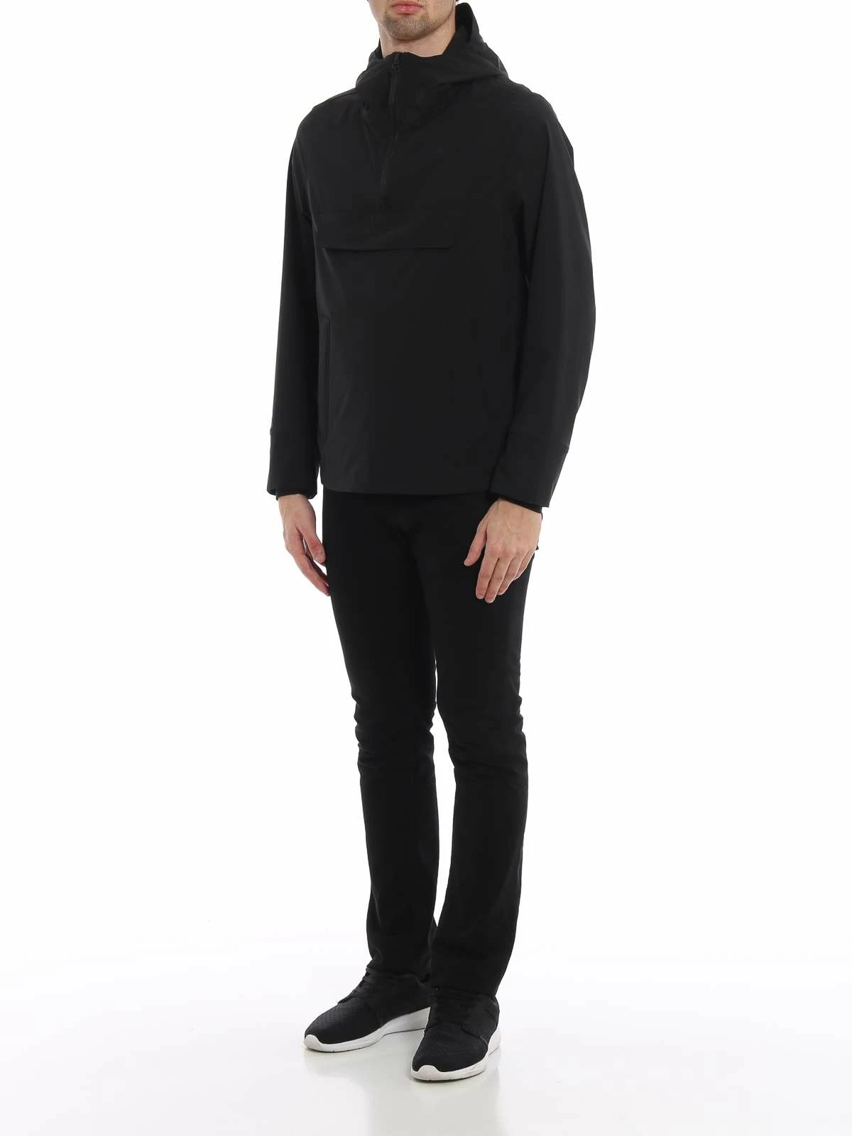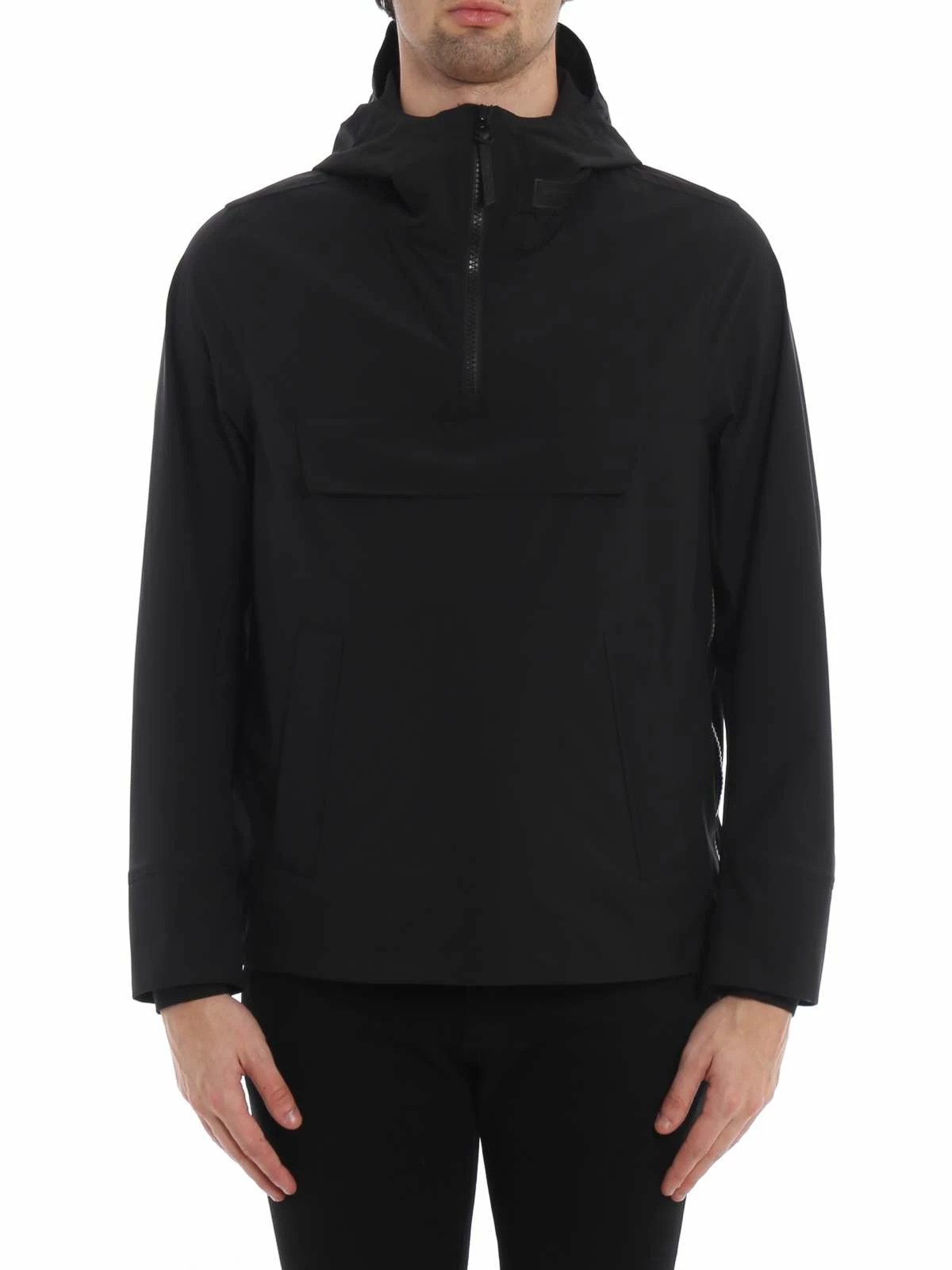 Long sleeve stretch technical satin jacket in black. Velcro tab with rubberized logo at stand collar. Adjustable Velcro fastening at back hood. Partial zip closure at front. Flap pocket with concealed zip closure at chest. Zippered kangaroo pocket at waist. Inset jersey cuffs. Concealed bungee-style drawstring at hem. Grey logo patterned lining. Black hardware. Tonal stitching. 90% polyester, 10% elastane.