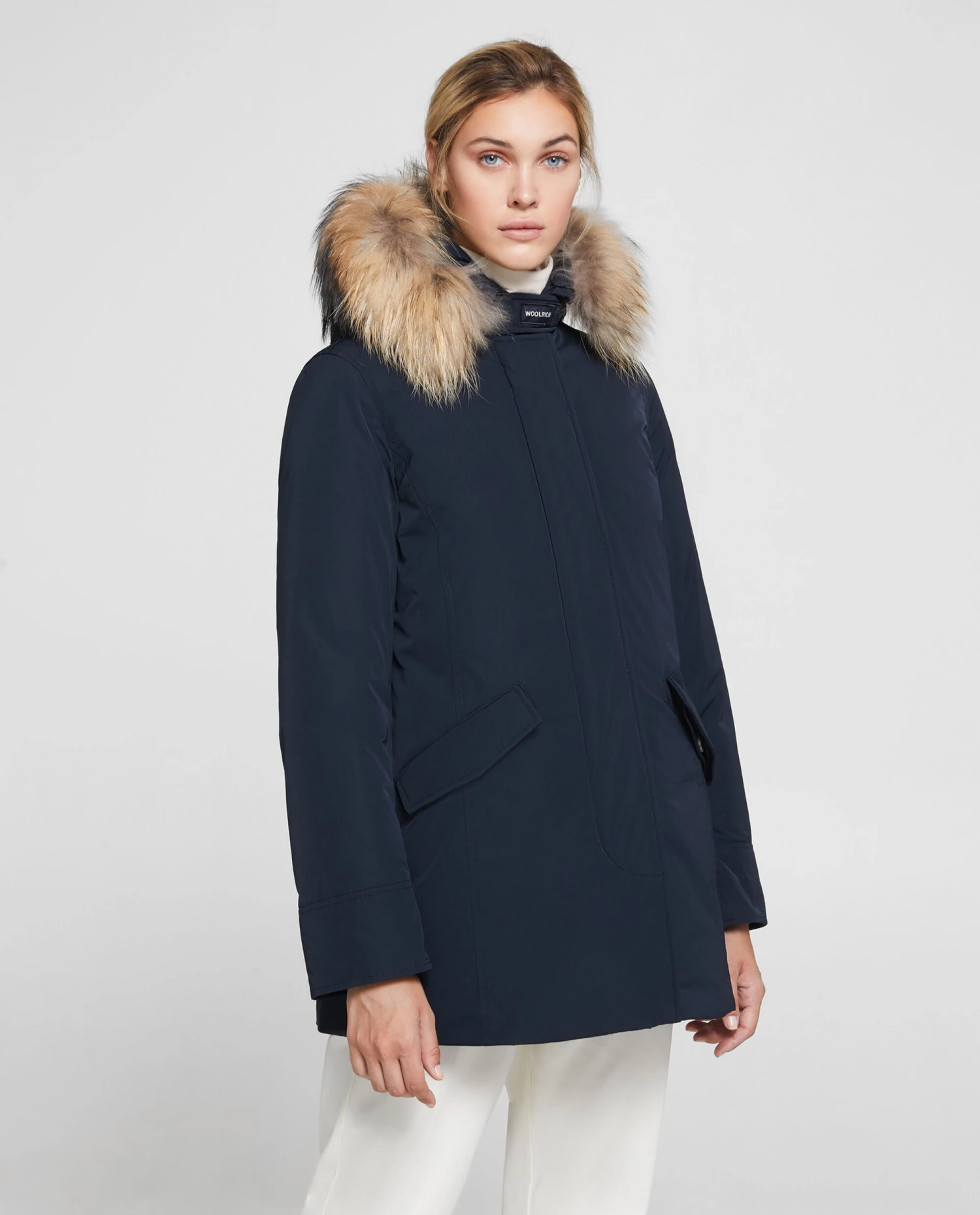 La icónica Arctic Parka, confeccionada en City Fabric hidrófugo, es una prenda elegante y sofisticada. De corte ceñido, cuenta con cuello rematado con pelo, cierre con cremallera y botones, bolsillos insertados con solapa y logotipo bordado en el cuello. El relleno es de pluma 70/30. Un clásico de Woolrich en una versión urban-chic ideal para looks day-to-night. Calidez Pesado Tejido exterior 100% Poliéster Revestimiento 100% Poliéster Acolchado 70% Pluma de Pato Gris 30% Plumas Piel Tanuki