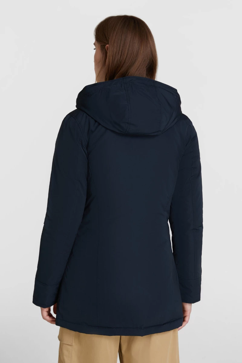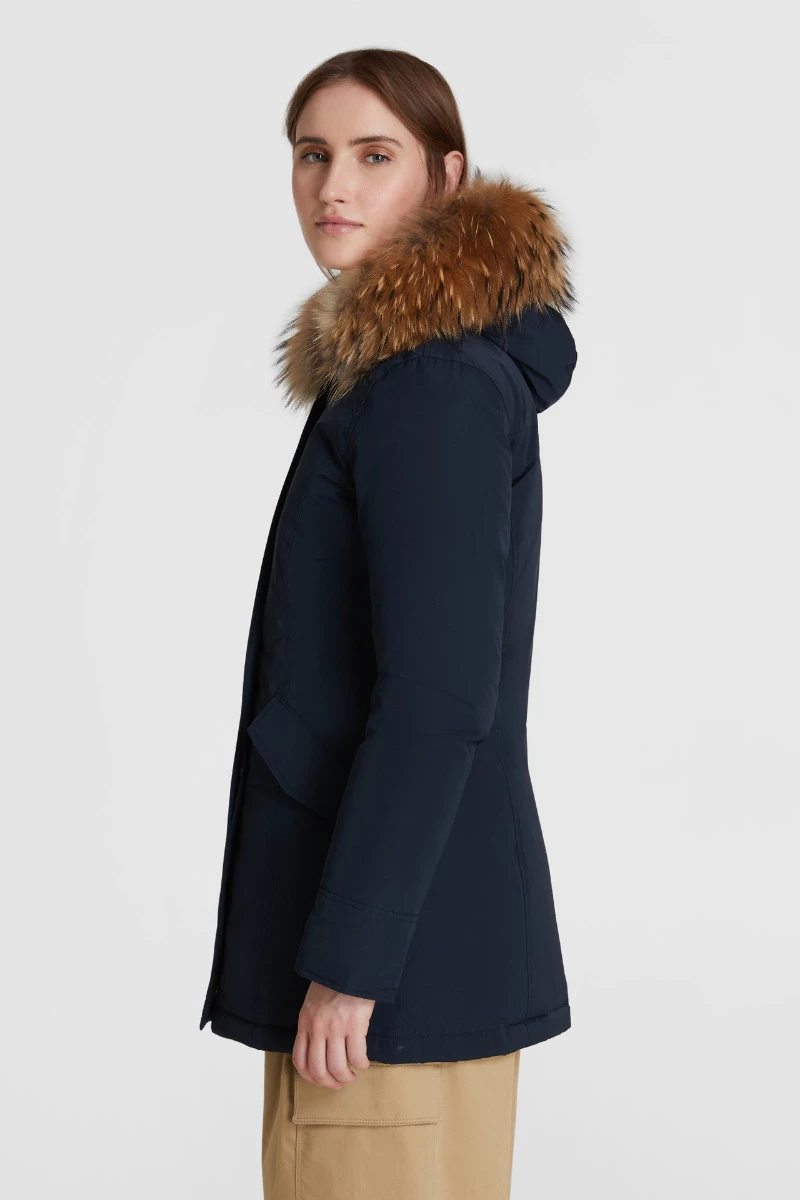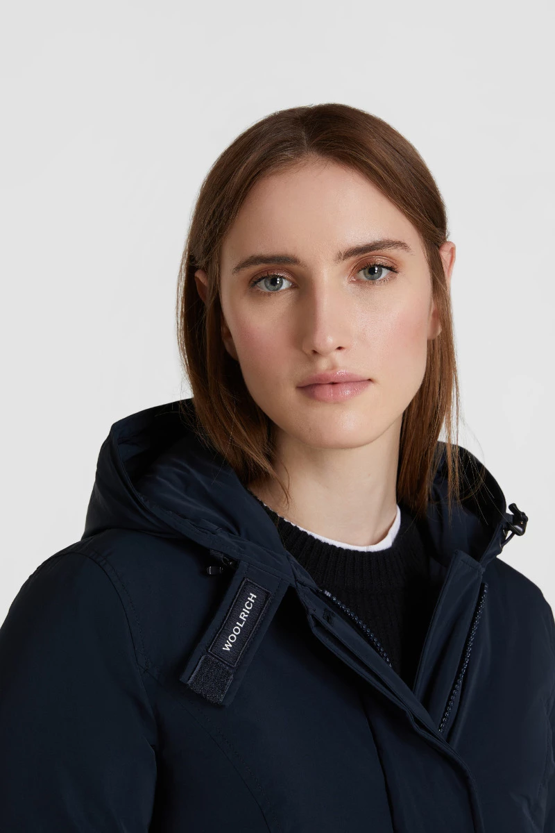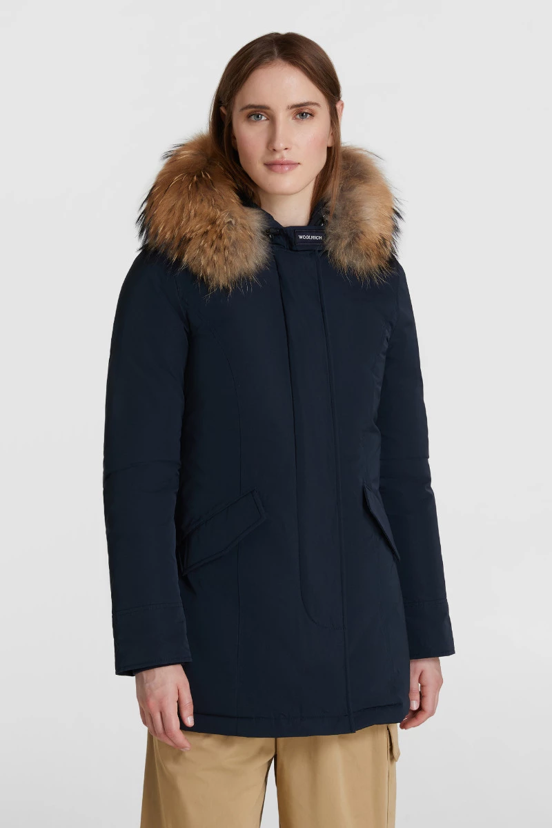 This Luxury Arctic parka for women shows a magnificent resistance that will keep you warm and dry without neglecting the style, becoming a mainstay of the winter wardrobe. This slim-fit polyester garment stands up to all the elements with character thanks to its wind-resistant and water-repellent properties, as well as the insulating duck down padding. The roomy hood is topped by a removable fur trim for a feminine touch, and classic practical details reflect the look inspired by Woolrich’s heritage.