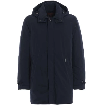 Technical fabric coat with practical detachable hood and down padding 90/10.
