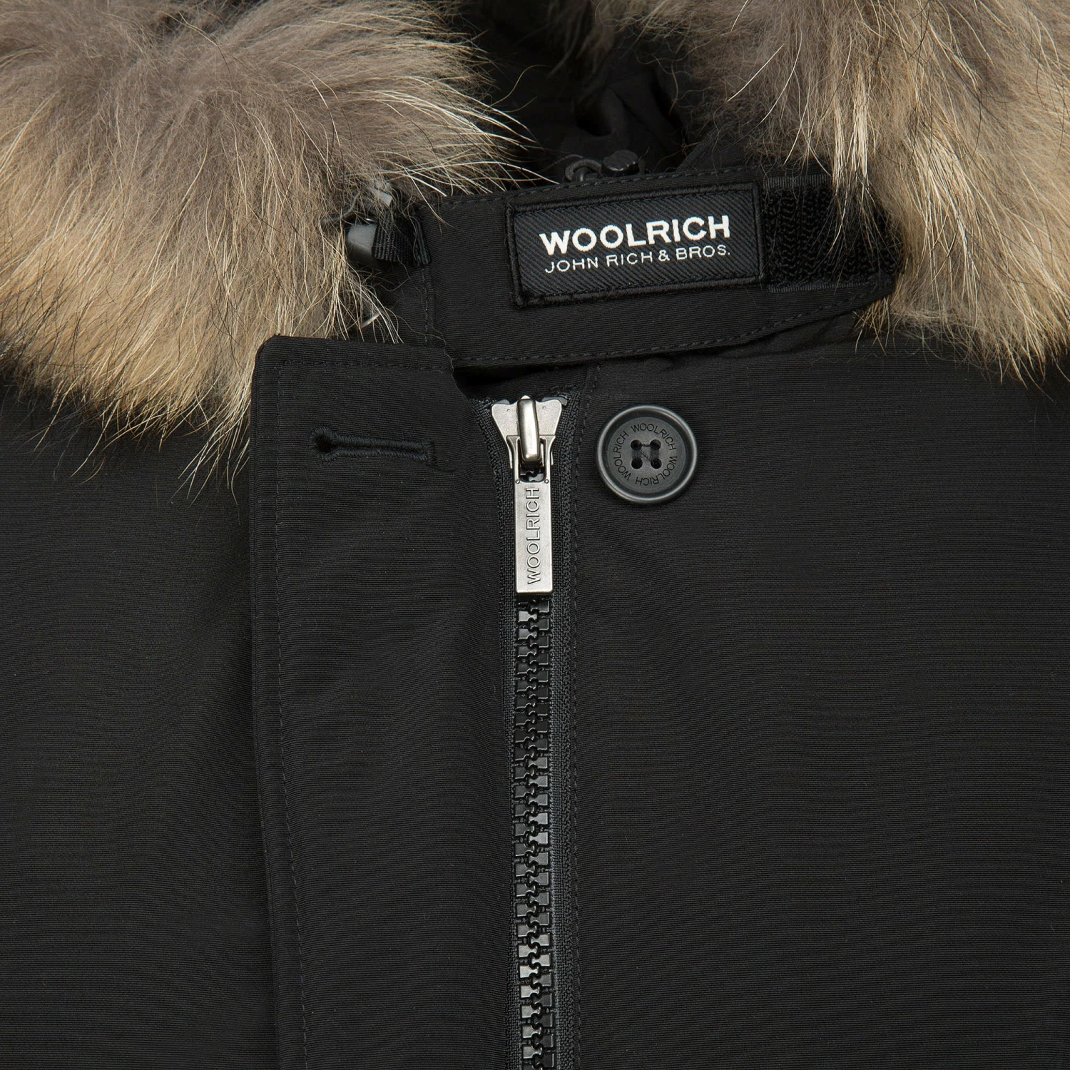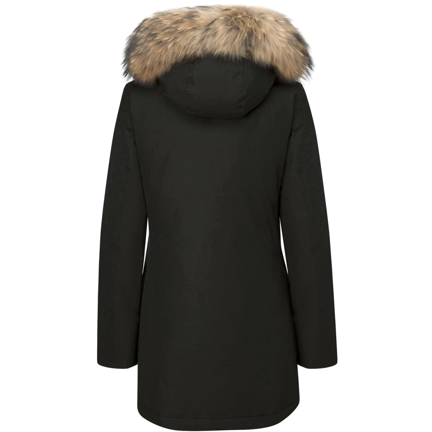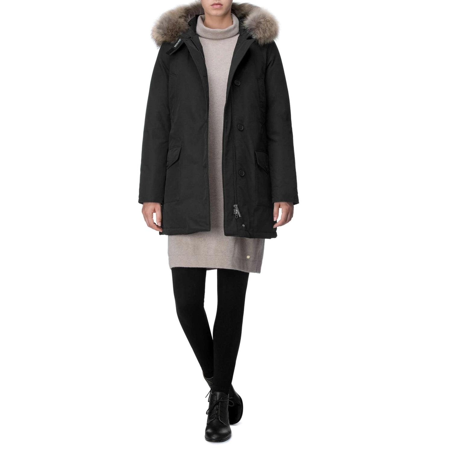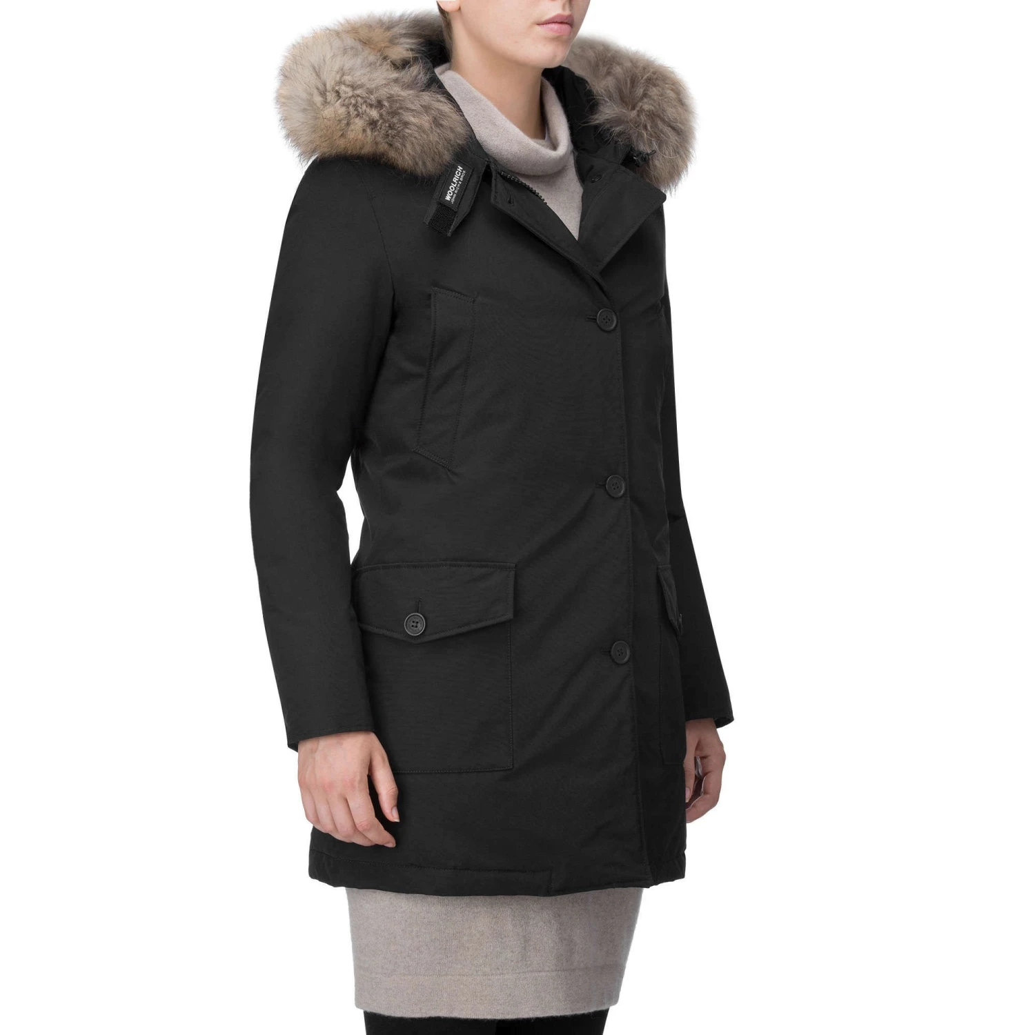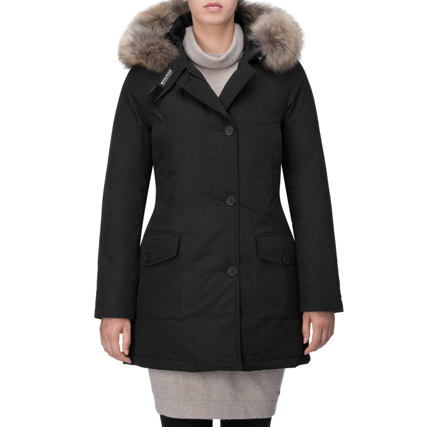 The iconic regular-fit arctic grim reaper with hand warmer pockets, flap pockets and detachable raccoon skin. Made with the classic Woolrich fabric with 60% cotton and 40% nylon, with a special Teflon finish, very resistant to snow, rain and wind. Zip and button closure; 80/20 duck down stuffing.